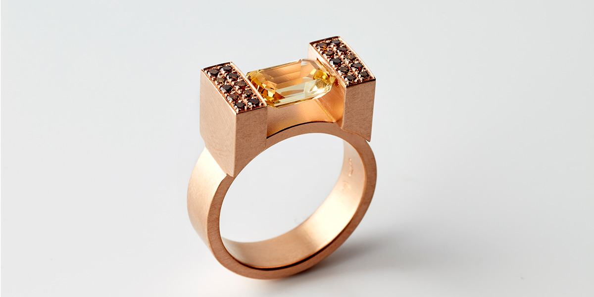 Finished with a natural emerald cut sapphire of 2.40ct, paired with fancy yellow-brown-orange diamonds of 0.23ct . No heating, color stability test type2, GRS Certified.