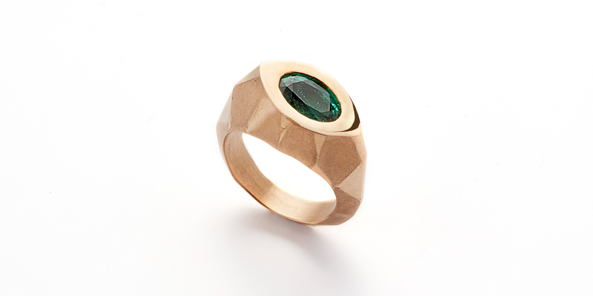Een ovale smaragd schuin gezet in een sculpturale ring, volledig gefaceteerd met afwisselende matte en gepolijste vlakjes.