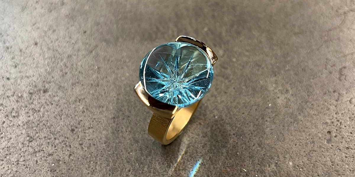 The unique flowerlike cut of this ring brings out the intrinsic and extraordinary features of each stone. The starflower gemstone is cut by hand and set in 18k gold Au750.