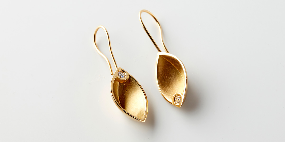 This pair of sculptural earrings ‘Diamond Intimacy’ is handmade in 18k yellow gold Au750. The earrings pictured here are made in 18k yellow gold, but you can choose the gold color of your preference.